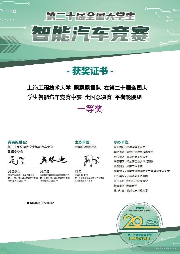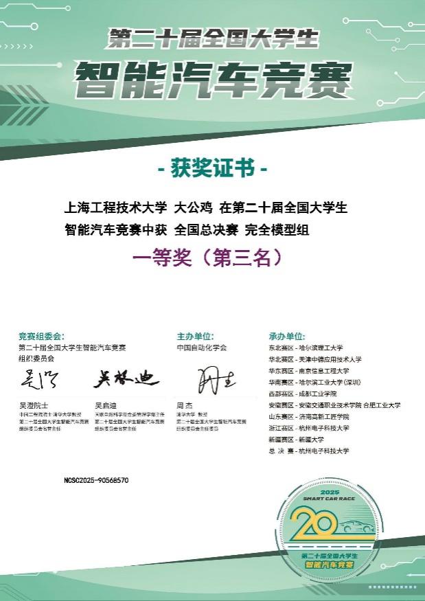 2025年第二十届全国大学生智能汽车竞赛全国总决赛一等奖获奖证书