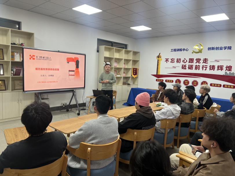 10月28日下午,江苏汇博机器人技术股份有限公司培训部部长吴博雄受邀走进工训中心《组态监控系统综合实践》课堂,完成了一堂关于“现场设备状态监测、数据采集、控制操作与可视化管理的集成化系统”的生动课程。